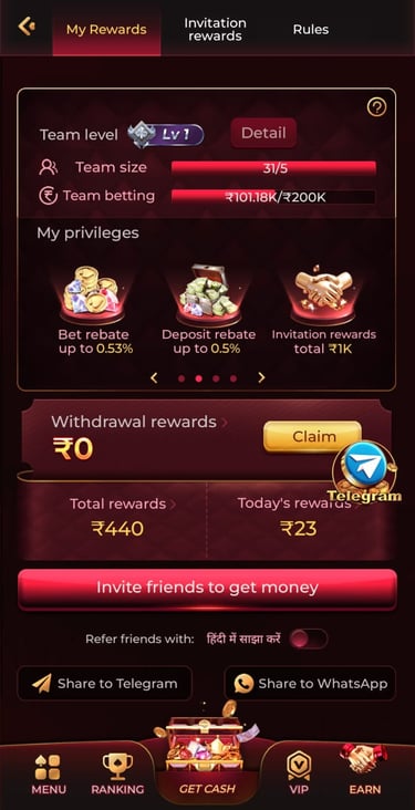 You can redeem referral rewards as in-game coins, convert them to cash, or withdraw them to your UPI/Paytm wallet once the minimum threshold is reached.